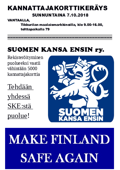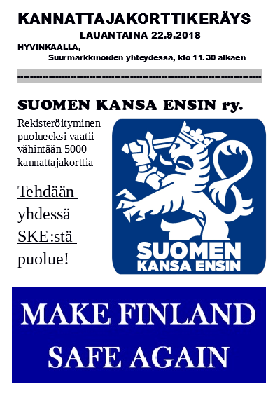 Lauantaina 27. lokakuuta 2018 klo 13.00 Kankaanpään torilla on mielenosoitus haittamaahanmuuttoa vastaan. Tapahtuman järjestää Suomen kansa ensin ry, mutta tapahtuma on yleiskansallismielinen, eli kaikki isänmaalliset ovat tervetulleita.