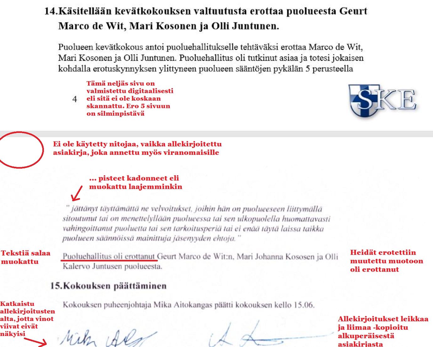 Videotallenne todistaa että puoluekokouksessa ei erotettu ketään. On totta että muutos kohtaan 14 kirjoitettiin jo allekirjoitettuun sivuun sähköisessä pöytäkirjassa.Sivu tulostettiin muutoksen jälkeen jotta pöytäkirjantarkastajat, kokouksen puheenjohtaja ja sihteeri saivat tarkastamisen jälkeen allekirjoittaa pöytäkirjan uudelleen. Tämä ei ole rikollista, vaan ihan käytössä oleva tapa.