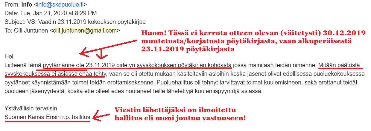 Toiseksi 2.1.2020 pyysin Kajaanin kokouksen pöytäkirjaa nostaakseni kanteen kyseisessä kokouksessa laittomasti tehdyn “erottamiseni” takia. Perusteettomasti sitä ei suostuttu antamaan minulle, vaan 21.1.2020 minulle lähetettiin ainoastaan pöytäkirjanote.